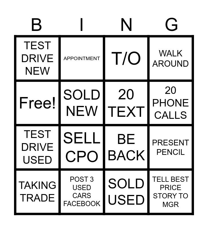 This bingo card has 16 words: POST 3 USED CARS FACEBOOK, PRESENT PENCIL, T/O, TEST DRIVE NEW, TEST DRIVE USED, APPOINTMENT, BE BACK, SOLD USED, Free!, SOLD NEW, TAKING TRADE, WALK AROUND, SELL CPO, 20 PHONE CALLS, 20 TEXT and TELL BEST PRICE STORY TO MGR.