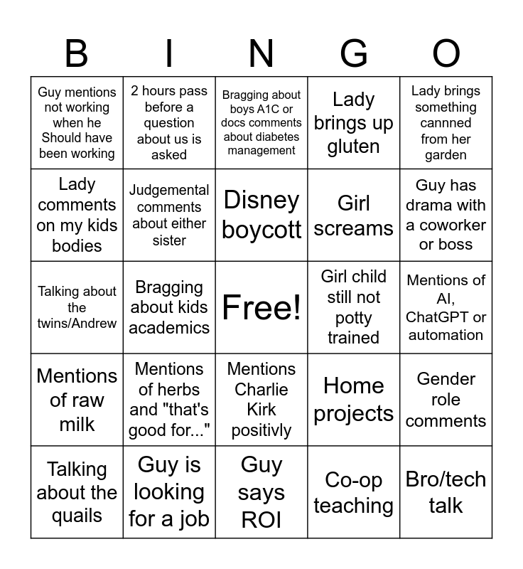 This bingo card has a free space and 29 words: Talking about the quails, Mention of revelations, Bragging about kids academics, Boy child being aggressive, Guy mentions not working when he Should have been working, Bragging about boys A1C or docs comments about diabetes management, Judgemental comments about either sister, Mentions of herbs and "that's good for...", Girl child still not potty trained, Guy is looking for a job, Mentions of AI, ChatGPT or automation, Bro/tech talk, Guy says ROI, Co-op teaching, Guy has drama with a coworker or boss, Lady mentions Aunt, Mentions Charlie Kirk positivly, Mentions of raw milk, Lady brings something cannned from her garden, Talking about the twins/Andrew, Home projects, social medias mentioned, Girl screams, Lady comments on my kids bodies, Lady brings up gluten, 2 hours pass before a question about us is asked, Gender role comments, Disney boycott and Another free vacation.