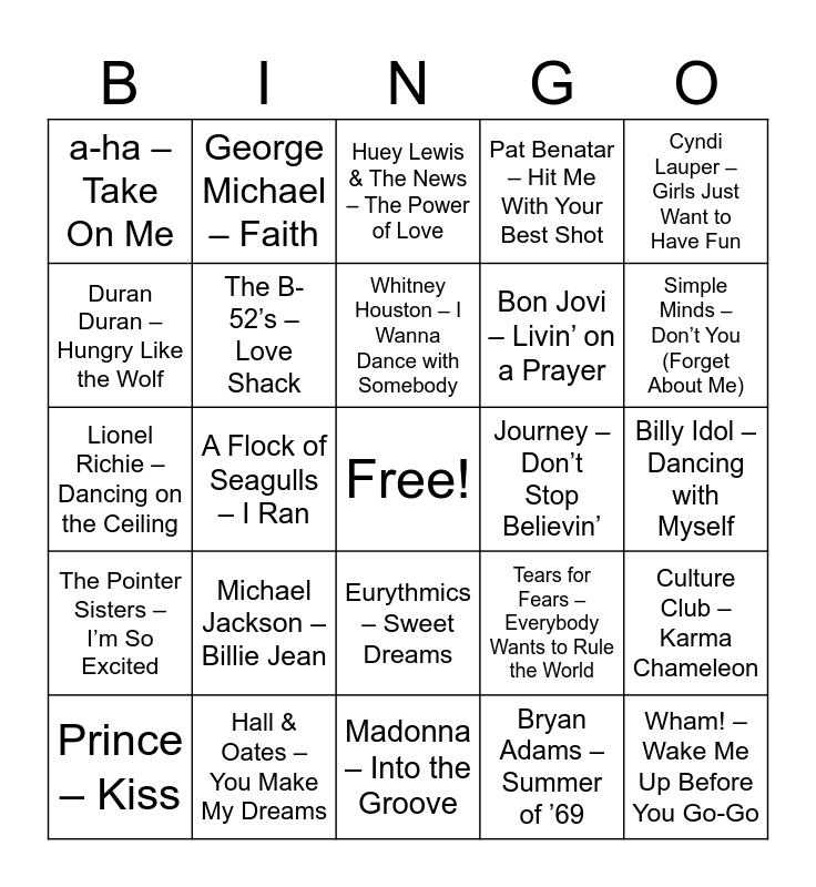 This bingo card has a free space and 25 words: Michael Jackson – Billie Jean, Madonna – Into the Groove, Whitney Houston – I Wanna Dance with Somebody, Prince – Kiss, Cyndi Lauper – Girls Just Want to Have Fun, a-ha – Take On Me, Duran Duran – Hungry Like the Wolf, George Michael – Faith, Journey – Don’t Stop Believin’, Eurythmics – Sweet Dreams, Bon Jovi – Livin’ on a Prayer, Lionel Richie – Dancing on the Ceiling, Tears for Fears – Everybody Wants to Rule the World, Culture Club – Karma Chameleon, The B-52’s – Love Shack, Rick Astley – Never Gonna Give You Up, Billy Idol – Dancing with Myself, Huey Lewis & The News – The Power of Love, Simple Minds – Don’t You (Forget About Me), A Flock of Seagulls – I Ran, Wham! – Wake Me Up Before You Go-Go, Hall & Oates – You Make My Dreams, The Pointer Sisters – I’m So Excited, Pat Benatar – Hit Me With Your Best Shot and Bryan Adams – Summer of ’69.