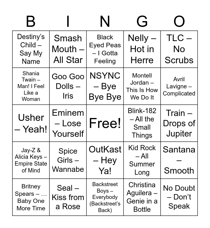 This bingo card has a free space and 25 words: Spice Girls – Wannabe, Backstreet Boys – Everybody (Backstreet’s Back), NSYNC – Bye Bye Bye, Britney Spears – …Baby One More Time, TLC – No Scrubs, Destiny’s Child – Say My Name, Shania Twain – Man! I Feel Like a Woman, Smash Mouth – All Star, Blink-182 – All the Small Things, OutKast – Hey Ya!, Montell Jordan – This Is How We Do It, Usher – Yeah!, Kid Rock – All Summer Long, Santana – Smooth, Goo Goo Dolls – Iris, Matchbox Twenty – 3AM, Train – Drops of Jupiter, Black Eyed Peas – I Gotta Feeling, Avril Lavigne – Complicated, Eminem – Lose Yourself, No Doubt – Don’t Speak, Seal – Kiss from a Rose, Jay-Z & Alicia Keys – Empire State of Mind, Nelly – Hot in Herre and Christina Aguilera – Genie in a Bottle.