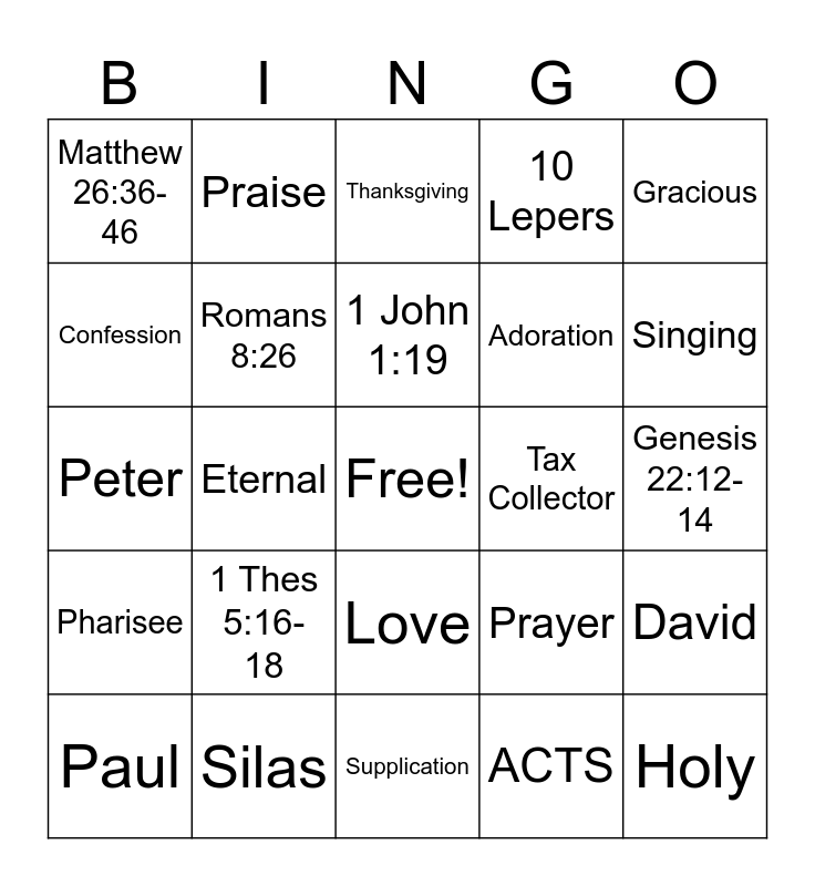 This bingo card has a free space and 27 words: Prayer, Worship, Adoration, Supplication, Confession, Thanksgiving, Praise, Pharisee, Tax Collector, David, Peter, 10 Lepers, Paul, Silas, Singing, Instuments, Romans 8:26, 1 John 1:19, 1 Thes 5:16-18, Matthew 26:36-46, Genesis 22:12-14, ACTS, Eternal, Holy, Love, Gracious and Just.