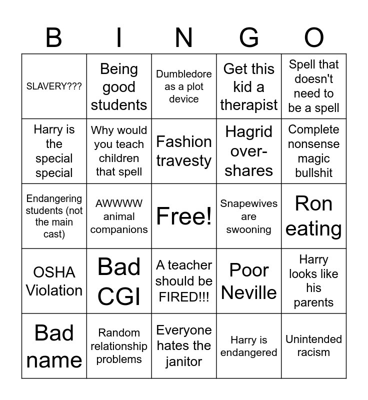 This bingo card has a free space and 43 words: Weird CGI, Unintended racism, Not like other girls, Bad name, Token character, Harry is endangered, Dumbledore as a plot device, How is this allowed in a school, Spell that doesn't need to be a spell, Random relationship problems, Get this kid a therapist, Snapewives are swooning, A teacher should be FIRED!!!, Bad CGI, Classism, Everyone hates the janitor, Wizard racism portrayed as good, Endangering students (not the main cast), Paintings as comedic relief, Complete nonsense magic bullshit, Being good students, Golden Trio cuties, Marauders fandom moment, SLAVERY???, “And Harry gets 2000 house points!”, Ron eating, What is the map of this school???, “Blimey”, Poor Neville, OSHA Violation, Actors ate, Harry looks like his parents, Normalized child abuse, AWWWW animal companions, “My father will hear about this”, McGonnagal girlboss, Draco + Harry obsessed w/ each other, Fashion travesty, Harry is the special special, Hagrid over-shares, Questionable ideas of gender, Why would you teach children that spell and Ugly ppl kys ig.