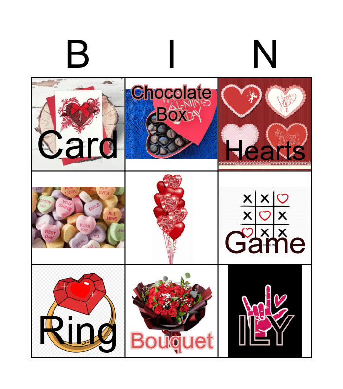 This bingo card has 14 images, a free space and 13 words: Strawberry chocolate, Cupcake, Ring, Chocolate Box, ILY, Bear, Gift, Bouquet, Card, Envelope, Game, Hearts and Candle.