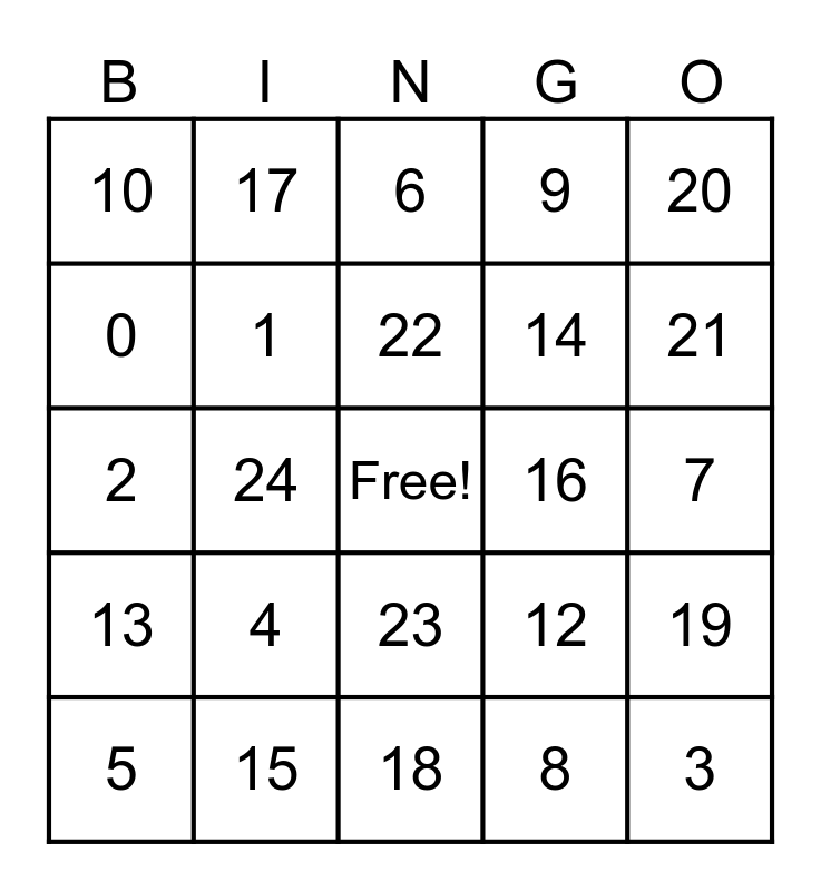 This bingo card has a free space and 24 words: 4, 15, 22, 5, 20, 10, 0, 17, 16, 23, 14, 2, 12, 19, 1, 8, 7, 6, 21, 24, 3, 13, 9 and 18.