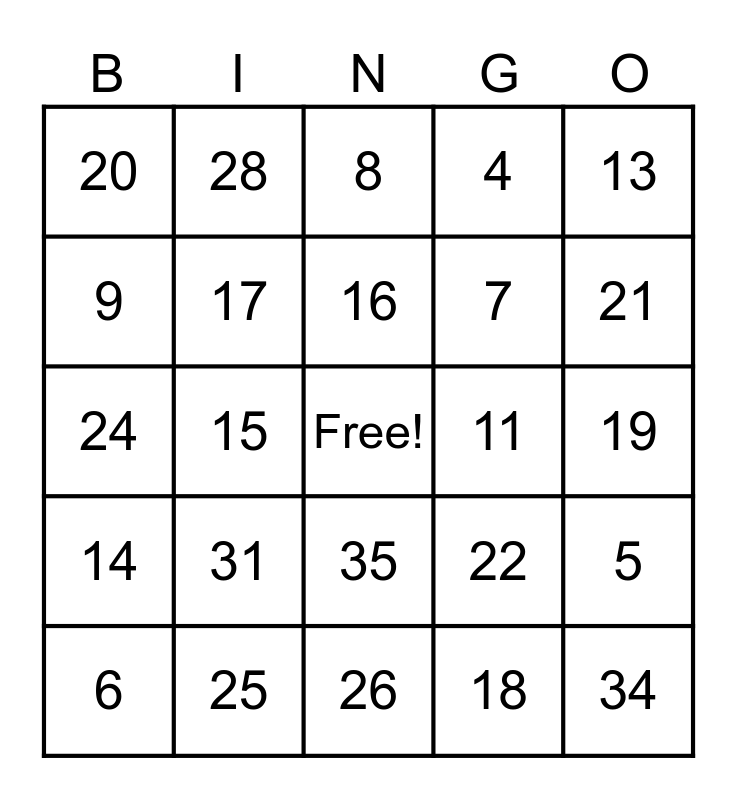 This bingo card has a free space and 24 words: 31, 25, 16, 6, 13, 20, 9, 28, 11, 35, 7, 24, 22, 5, 17, 18, 19, 8, 21, 15, 34, 14, 4 and 26.