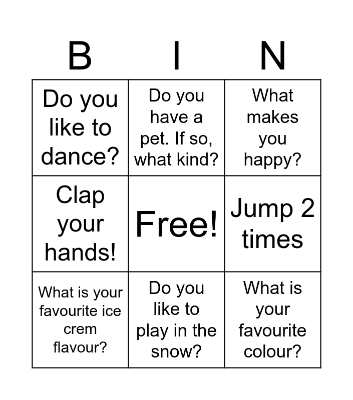 This bingo card has a free space and 8 words: Jump 2 times, What makes you happy?, Do you have a pet. If so, what kind?, What is your favourite ice crem flavour?, Do you like to dance?, What is your favourite colour?, Clap your hands! and Do you like to play in the snow?.