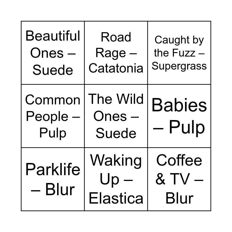 This bingo card has 60 words: Wonderwall – Oasis, Don't Look Back in Anger – Oasis, Live Forever – Oasis, Champagne Supernova – Oasis, Some Might Say – Oasis, Song 2 – Blur, Parklife – Blur, Girls & Boys – Blur, Coffee & TV – Blur, The Universal – Blur, Common People – Pulp, Disco 2000 – Pulp, Babies – Pulp, Do You Remember the First Time? – Pulp, Animal Nitrate – Suede, Beautiful Ones – Suede, Trash – Suede, The Wild Ones – Suede, Connection – Elastica, Waking Up – Elastica, Alright – Supergrass, Caught by the Fuzz – Supergrass, Pumping on Your Stereo – Supergrass, Bittersweet Symphony – The Verve, The Drugs Don't Work – The Verve, Lucky Man – The Verve, There She Goes – The La’s, How Soon Is Now? – The Smiths, This Charming Man – The Smiths, A Design for Life – Manic Street Preachers, If You Tolerate This Your Children Will Be Next – Manic Street Preachers, Sit Down – James, Laid – James, Mulder and Scully – Catatonia, Road Rage – Catatonia, Brimful of Asha – Cornershop, Tattva – Kula Shaker, Hey Dude – Kula Shaker, The Only One I Know – The Charlatans, North Country Boy – The Charlatans, Walkaway – Cast, Alright – Cast, Staying Out for the Summer – Dodgy, Good Enough – Dodgy, You Only Get What You Give – New Radicals, Ready to Go – Republica, Firestarter – The Prodigy, Bitter Sweet Symphony – The Verve, Club Foot – Kasabian, I Bet You Look Good on the Dancefloor – Arctic Monkeys, Tender – Blur, She's Electric – Oasis, Roll With It – Oasis, Mis-Shapes – Pulp, Saturday Night – Suede, Sun Hits the Sky – Supergrass, Alright – Supergrass ), Parklife (feat. Phil Daniels) – Blur, Supersonic – Oasis and Common People (Full Length Version) – Pulp.