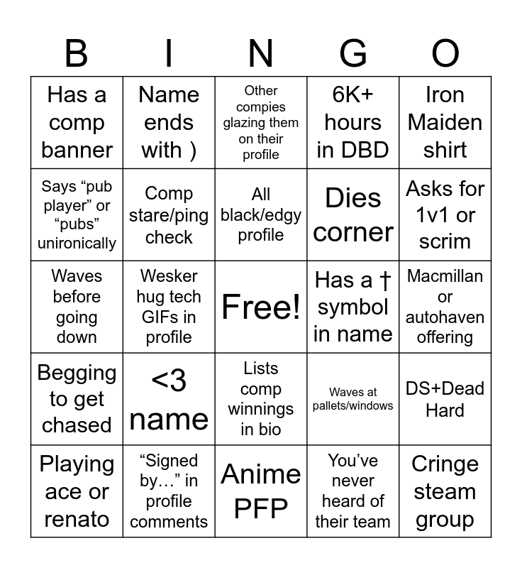 This bingo card has a free space and 24 words: <3 name, “Signed by…” in profile comments, All black/edgy profile, Playing ace or renato, Iron Maiden shirt, Has a comp banner, Says “pub player” or “pubs” unironically, Name ends with ), Has a † symbol in name, Lists comp winnings in bio, Dies corner, Waves before going down, Waves at pallets/windows, DS+Dead Hard, Comp stare/ping check, You’ve never heard of their team, Macmillan or autohaven offering, Other compies glazing them on their profile, Asks for 1v1 or scrim, Wesker hug tech GIFs in profile, Cringe steam group, Begging to get chased, 6K+ hours in DBD and Anime PFP.