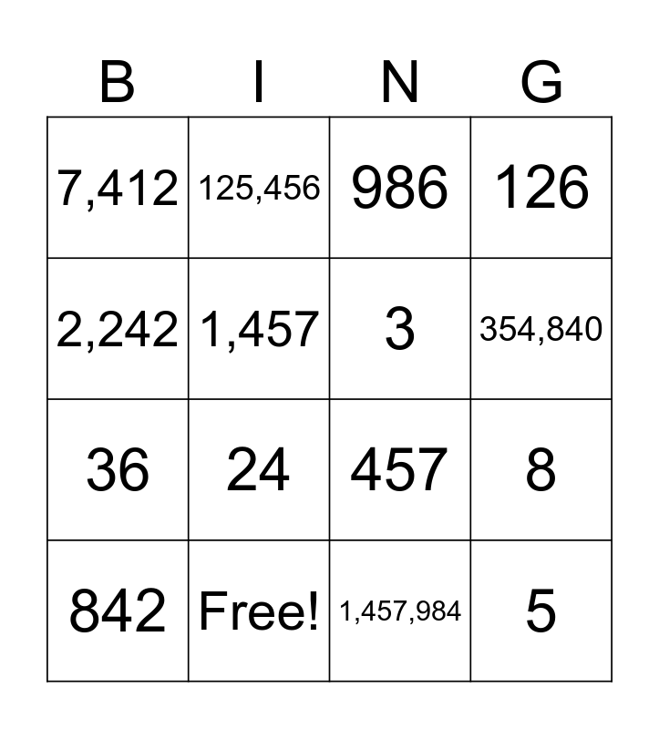 This bingo card has 16 words: Free!, 8, 986, 7,412, 36, 125,456, 457, 1,457,984, 2,242, 1,457, 842, 126, 24, 354,840, 3 and 5.
