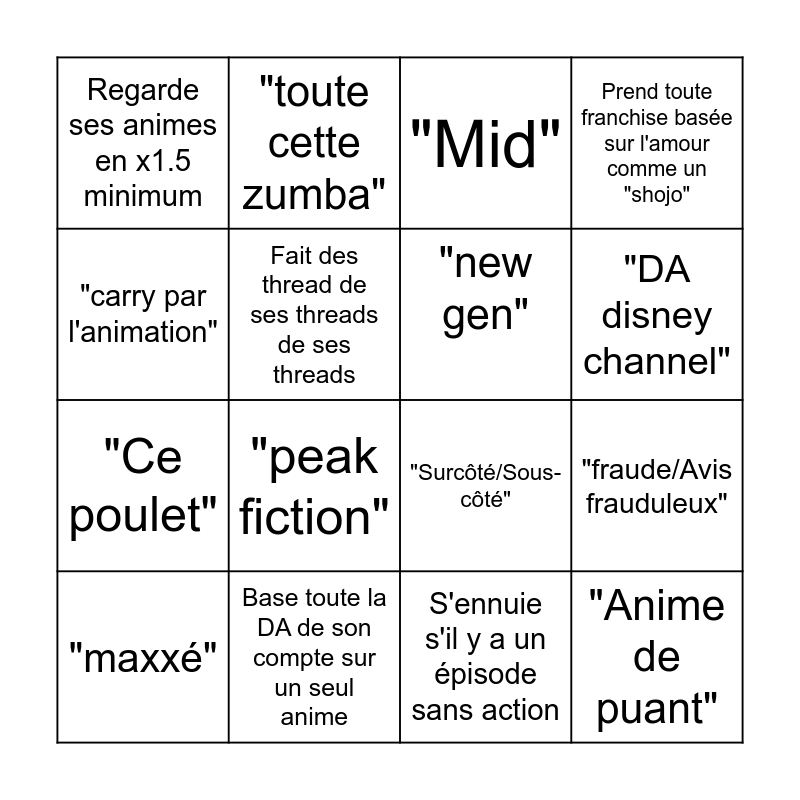 This bingo card has 16 words: Base toute la DA de son compte sur un seul anime, "fraude/Avis frauduleux", "Mid", Regarde ses animes en x1.5 minimum, "Ce poulet", "toute cette zumba", "Surcôté/Sous-côté", S'ennuie s'il y a un épisode sans action, "carry par l'animation", Fait des thread de ses threads de ses threads, "maxxé", Prend toute franchise basée sur l'amour comme un "shojo", "peak fiction", "DA disney channel", "new gen" and "Anime de puant".