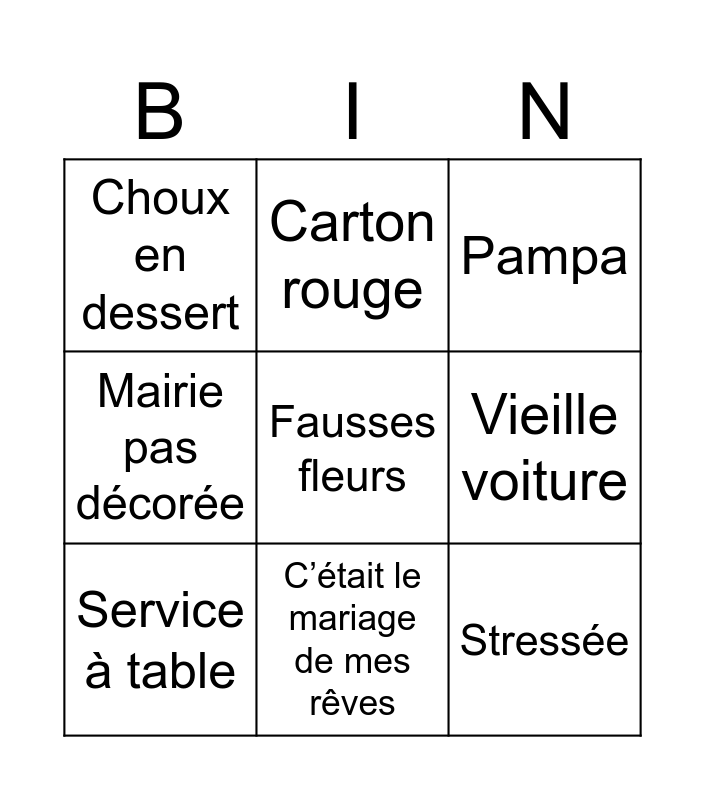 This bingo card has a free space and 8 words: Vieille voiture, Pampa, Carton rouge, Service à table, Choux en dessert, Stressée, Mairie pas décorée and C’était le mariage de mes rêves.