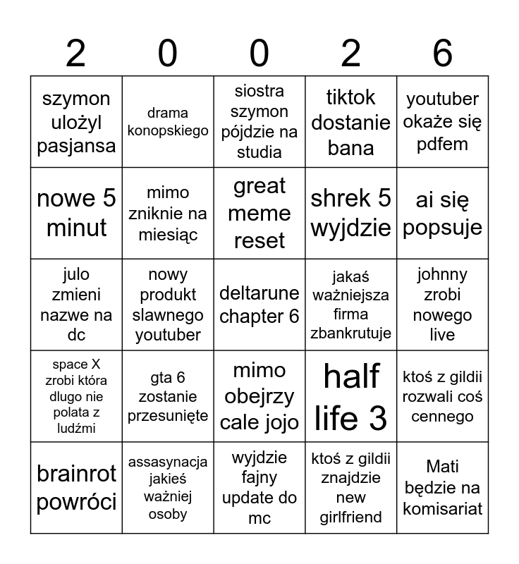 This bingo card has a free space and 24 words: gta 6 zostanie przesunięte, assasynacja jakieś ważniej osoby, great meme reset, brainrot powróci, youtuber okaże się pdfem, szymon ulożyl pasjansa, nowe 5 minut, drama konopskiego, jakaś ważniejsza firma zbankrutuje, mimo obejrzy cale jojo, shrek 5 wyjdzie, julo zmieni nazwe na dc, half life 3, ktoś z gildii rozwali coś cennego, mimo zniknie na miesiąc, ktoś z gildii znajdzie new girlfriend, johnny zrobi nowego live, siostra szymon pójdzie na studia, ai się popsuje, nowy produkt slawnego youtuber, Mati będzie na komisariat, space X zrobi która dlugo nie polata z ludźmi, tiktok dostanie bana and wyjdzie fajny update do mc.