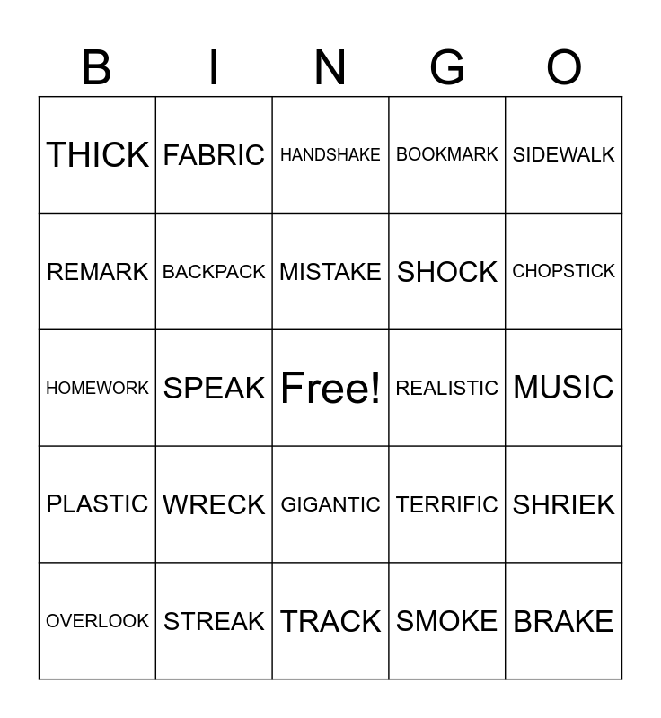 This bingo card has a free space and 24 words: WRECK, STREAK, MISTAKE, OVERLOOK, SIDEWALK, THICK, REMARK, FABRIC, REALISTIC, GIGANTIC, SHOCK, HOMEWORK, TERRIFIC, SHRIEK, BACKPACK, SMOKE, MUSIC, HANDSHAKE, CHOPSTICK, SPEAK, BRAKE, PLASTIC, BOOKMARK and TRACK.