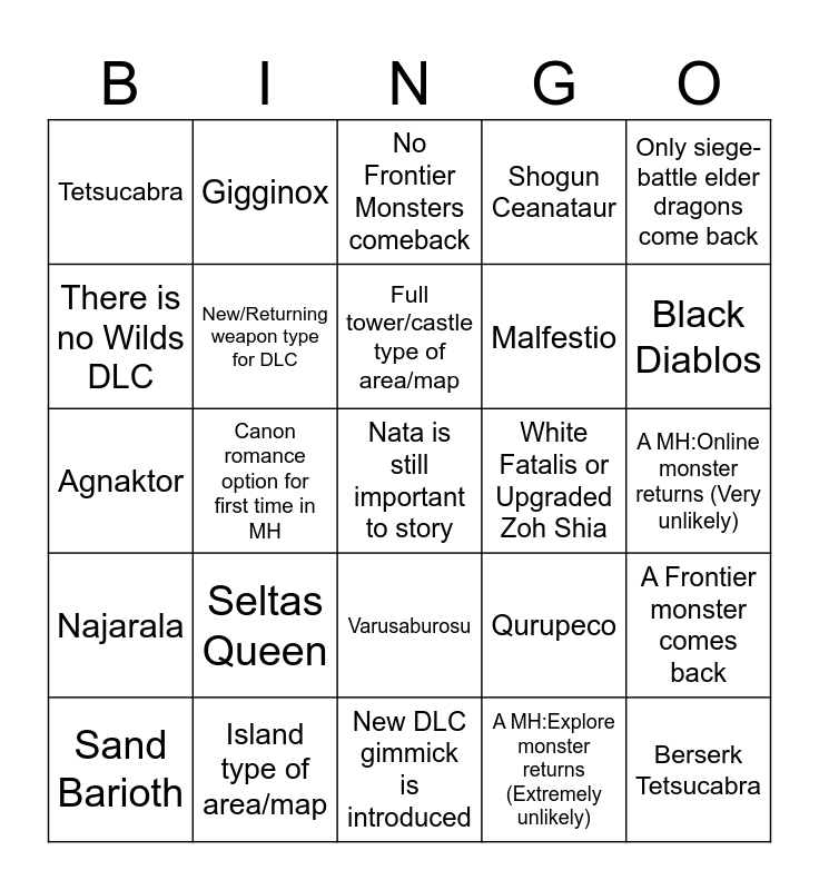 This bingo card has a free space and 24 words: Seltas Queen, Island type of area/map, Full tower/castle type of area/map, Sand Barioth, Only siege-battle elder dragons come back, Tetsucabra, There is no Wilds DLC, Gigginox, White Fatalis or Upgraded Zoh Shia, Varusaburosu, Malfestio, Agnaktor, Qurupeco, A Frontier monster comes back, New/Returning weapon type for DLC, A MH:Explore monster returns (Extremely unlikely), A MH:Online monster returns (Very unlikely), No Frontier Monsters comeback, Black Diablos, Canon romance option for first time in MH, Berserk Tetsucabra, Najarala, Shogun Ceanataur and New DLC gimmick is introduced.
