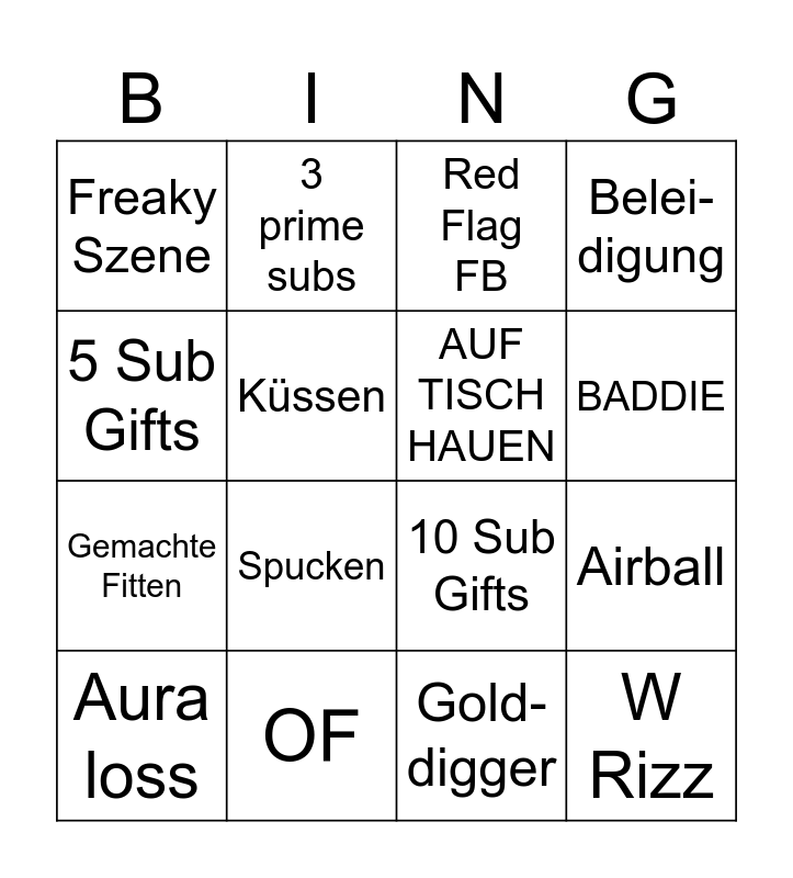 This bingo card has 16 words: OF, Airball, Red Flag FB, Freaky Szene, Gemachte Fitten, 3 prime subs, 10 Sub Gifts, Gold- digger, 5 Sub Gifts, Küssen, Aura loss, Belei- digung, Spucken, BADDIE, AUF TISCH HAUEN and W Rizz.