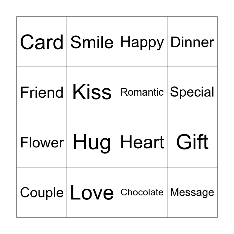 This bingo card has 16 words: Love, Gift, Happy, Card, Flower, Smile, Heart, Chocolate, Friend, Kiss, Couple, Dinner, Hug, Special, Romantic and Message.