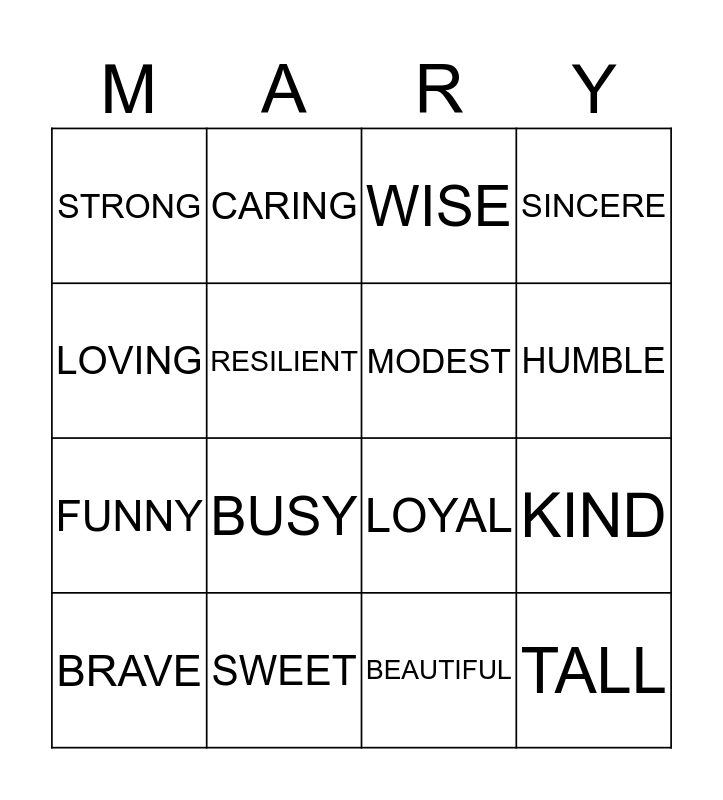 This bingo card has 16 words: SWEET, KIND, WISE, STRONG, FUNNY, CARING, LOYAL, BEAUTIFUL, LOVING, RESILIENT, BRAVE, SINCERE, BUSY, HUMBLE, MODEST and TALL.