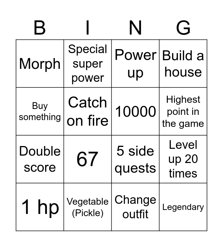 This bingo card has 16 words: Vegetable (Pickle), Level up 20 times, Power up, Morph, Double score, Special super power, 5 side quests, Change outfit, Buy something, Catch on fire, 1 hp, Build a house, 67, Highest point in the game, 10000 and Legendary.