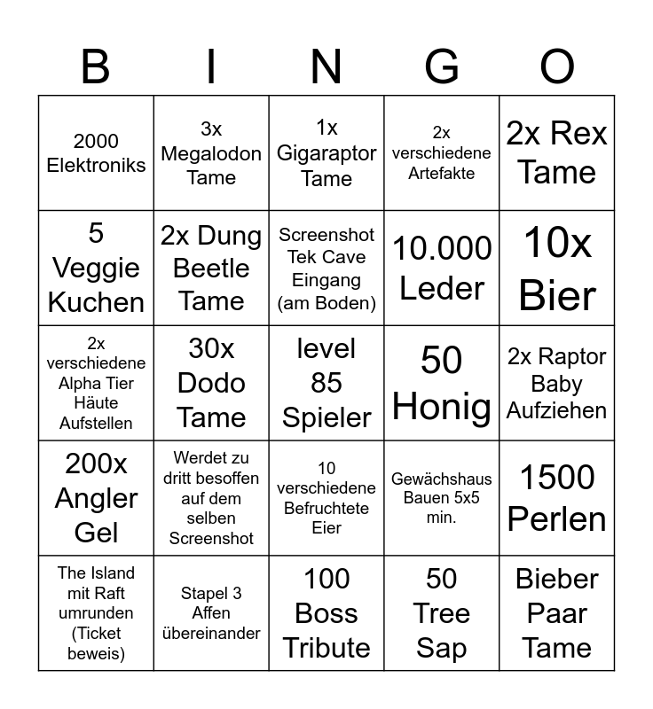 This bingo card has a free space and 24 words: Werdet zu dritt besoffen auf dem selben Screenshot, Stapel 3 Affen übereinander, Screenshot Tek Cave Eingang (am Boden), The Island mit Raft umrunden (Ticket beweis), 2x Rex Tame, 2000 Elektroniks, 5 Veggie Kuchen, 3x Megalodon Tame, 50 Honig, 10 verschiedene Befruchtete Eier, 10.000 Leder, 2x verschiedene Alpha Tier Häute Aufstellen, Gewächshaus Bauen 5x5 min., 1500 Perlen, 2x Dung Beetle Tame, 50 Tree Sap, 2x Raptor Baby Aufziehen, 1x Gigaraptor Tame, 10x Bier, 30x Dodo Tame, Bieber Paar Tame, 200x Angler Gel, 2x verschiedene Artefakte and 100 Boss Tribute.