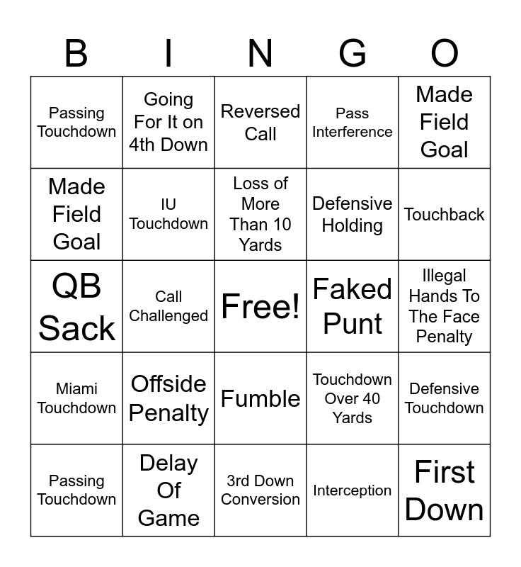 This bingo card has a free space and 32 words: Interception, Two-Point Conversion, Call Challenged, Trick Play, Miami Touchdown, IU Touchdown, Made Field Goal, Defensive Touchdown, Going For It on 4th Down, False Start, Loss of More Than 10 Yards, Reversed Call, Missed Field Goal, Any Team Scores More Than 20 Points, Faked Punt, Faked Field Goal, Passing Touchdown, QB Sack, Fumble, Offside Penalty, Touchdown Over 40 Yards, QB Rushing Touchdown, Illegal Hands To The Face Penalty, Delay Of Game, First Down, Pass Interference, Defensive Holding, Made Field Goal, Passing Touchdown, 3rd Down Conversion, Injury Timeout and Touchback.