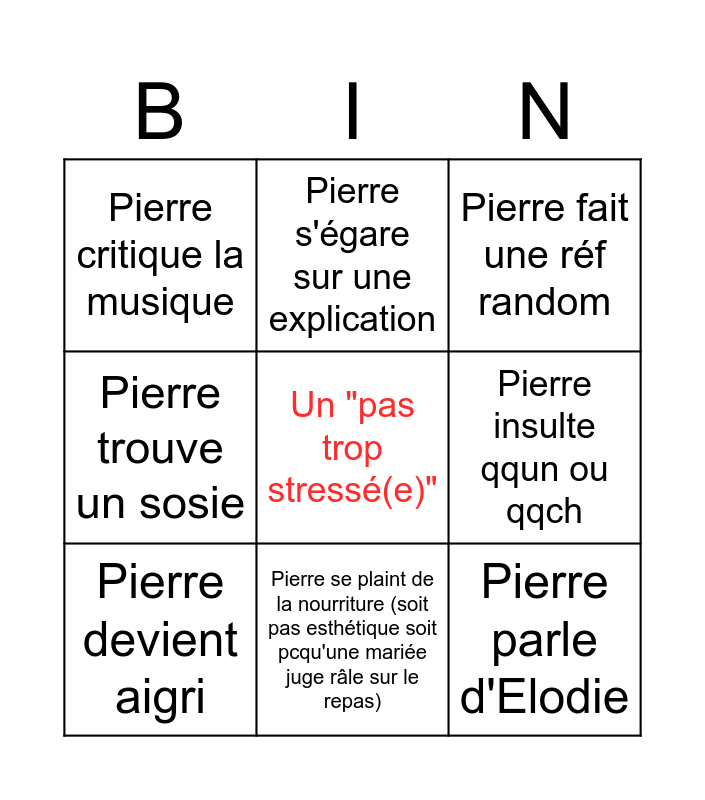 This bingo card has a free space and 8 words: Pierre insulte qqun ou qqch, Pierre fait une réf random, Pierre s'égare sur une explication, Pierre devient aigri, Pierre critique la musique, Pierre parle d'Elodie, Pierre trouve un sosie and Pierre se plaint de la nourriture (soit pas esthétique soit pcqu'une mariée juge râle sur le repas).