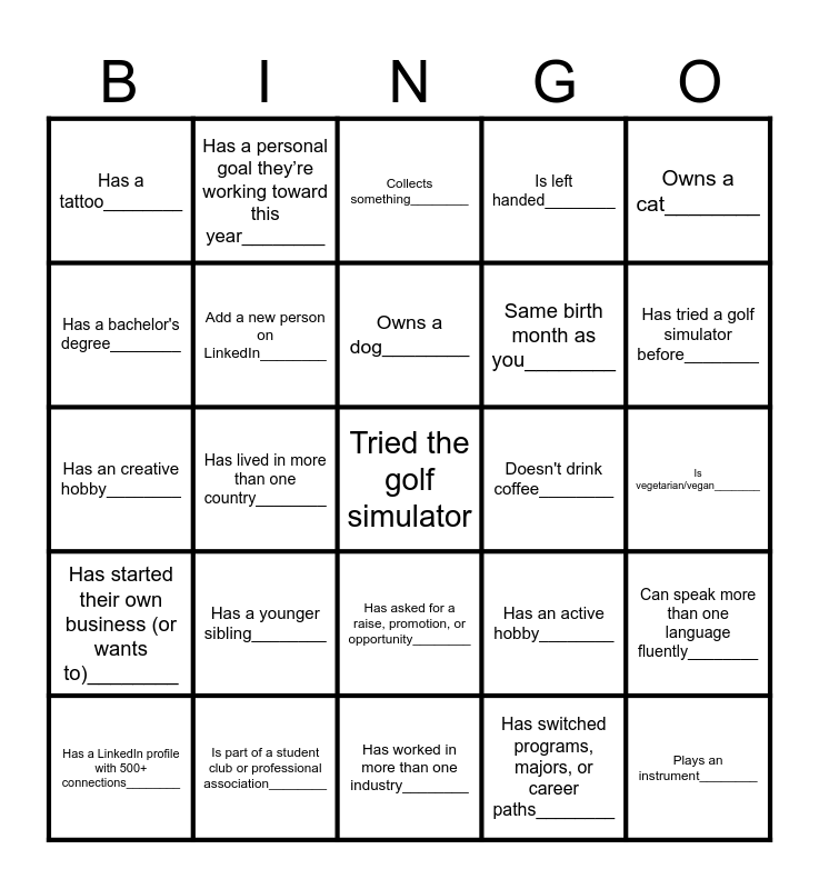 This bingo card has a free space and 38 words: Has never golfed before (excluding mini golf)________, Came to the event solo________, Studies or studied marketing________, Add a new person on LinkedIn________, Can speak more than one language fluently________, Has a younger sibling________, Owns a dog________, Likes to read (can recommend a book)________, Owns a cat________, Same birth month as you________, Has lived in more than one country________, Is left handed________, Plays an instrument________, Is vegetarian/vegan________, Has a bachelor's degree________, Has started their own business (or wants to)________, Has volunteered in the past year________, Collects something________, The same age as you________, Doesn't drink coffee________, Has a tattoo________, Is part of a student club or professional association________, Has tried a golf simulator before________, Has a LinkedIn profile with 500+ connections________, Works part-time while studying________, Has worked in more than one industry________, Has organized an event or fundraiser________, Has managed a social media account________, Is currently job searching________, Is an introvert________, Has celebrated a recent win (big or small)________, Has asked for a raise, promotion, or opportunity________, Has switched programs, majors, or career paths________, Has a personal goal they’re working toward this year________, Has travelled for school or work________, Has an active hobby________, Has an creative hobby________ and Can share an item on their bucket list________.
