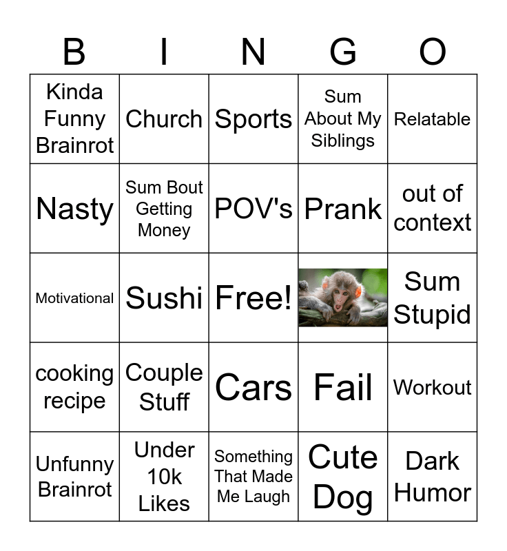 This bingo card has 1 images, a free space and 23 words: Couple Stuff, Under 10k Likes, POV's, Unfunny Brainrot, Relatable, Kinda Funny Brainrot, Nasty, Church, Cars, Prank, Motivational, Fail, Workout, Sum Bout Getting Money, Cute Dog, Sum Stupid, Sports, out of context, Sushi, Dark Humor, cooking recipe, Sum About My Siblings and Something That Made Me Laugh.
