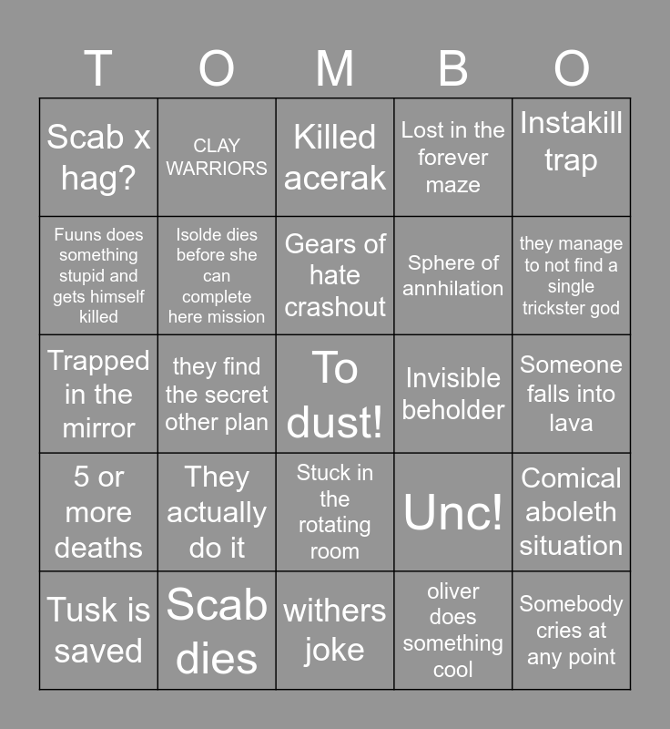 This bingo card has a free space and 24 words: They actually do it, Scab dies, Gears of hate crashout, Tusk is saved, Instakill trap, Scab x hag?, Fuuns does something stupid and gets himself killed, CLAY WARRIORS, Invisible beholder, Stuck in the rotating room, Sphere of annhilation, Trapped in the mirror, Unc!, Comical aboleth situation, Isolde dies before she can complete here mission, oliver does something cool, Someone falls into lava, Killed acerak, they manage to not find a single trickster god, they find the secret other plan, Somebody cries at any point, 5 or more deaths, Lost in the forever maze and withers joke.