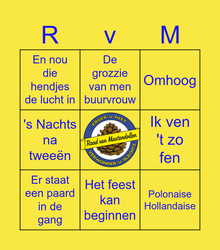 This bingo card has a free space and 8 words: 's Nachts na tweeën, De grozzie van men buurvrouw, Ik ven 't zo fen, Er staat een paard in de gang, Omhoog, En nou die hendjes de lucht in, Het feest kan beginnen and Polonaise Hollandaise.