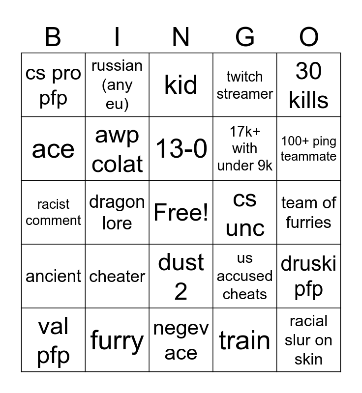 This bingo card has a free space and 24 words: cheater, furry, 13-0, val pfp, 30 kills, cs pro pfp, ace, russian (any eu), cs unc, dust 2, 17k+ with under 9k, racist comment, us accused cheats, druski pfp, awp colat, train, team of furries, kid, 100+ ping teammate, dragon lore, racial slur on skin, ancient, twitch streamer and negev ace.