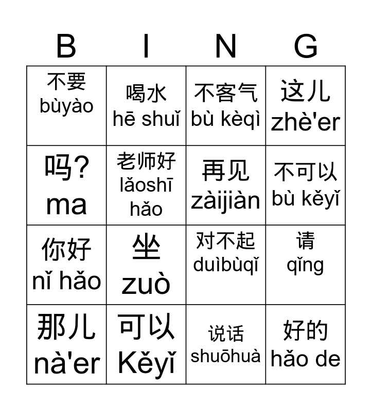 This bingo card has 16 words: 可以 Kěyǐ, 请 qǐng, 不客气 bù kèqì, 不要 bùyào, 你好 nǐ hǎo, 喝水 hē shuǐ, 对不起 duìbùqǐ, 说话 shuōhuà, 吗? ma, 老师好 lǎoshī hǎo, 那儿 nà'er, 这儿 zhè'er, 坐 zuò, 不可以 bù kěyǐ, 再见 zàijiàn and 好的 hǎo de.