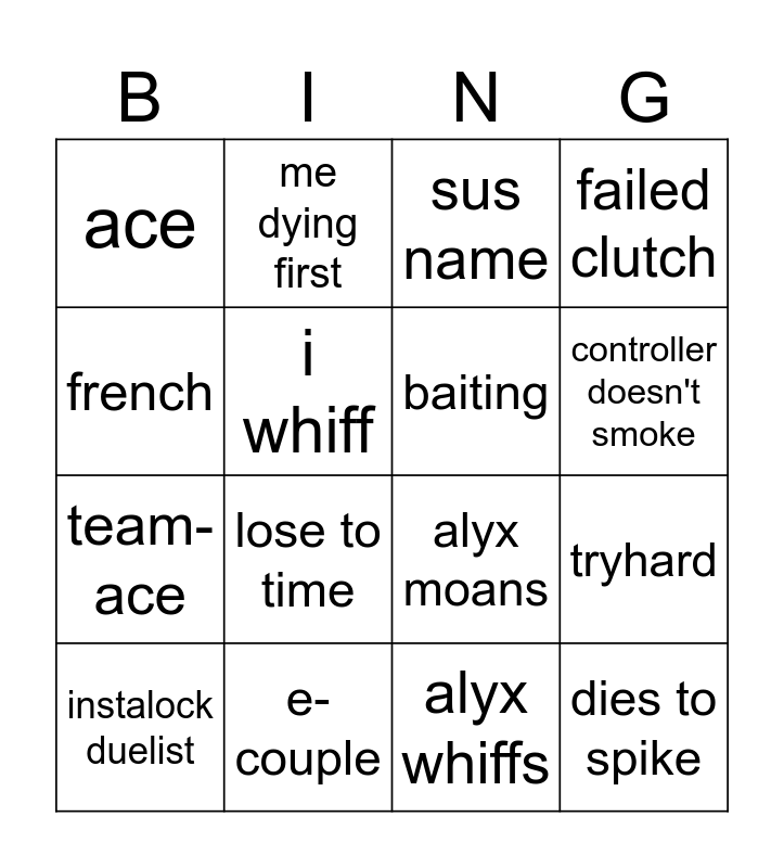 This bingo card has 16 words: e-couple, tryhard, sus name, ace, team-ace, me dying first, alyx moans, alyx whiffs, french, i whiff, instalock duelist, failed clutch, lose to time, controller doesn't smoke, baiting and dies to spike.