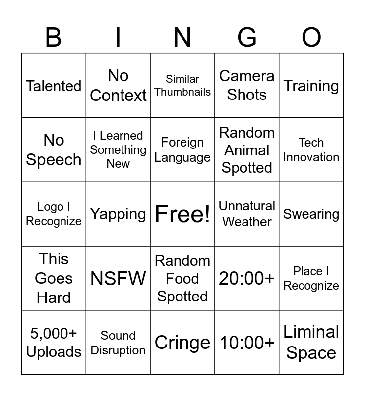 This bingo card has a free space and 24 words: NSFW, Sound Disruption, Foreign Language, 5,000+ Uploads, Training, Talented, No Speech, No Context, Unnatural Weather, Random Food Spotted, Random Animal Spotted, Logo I Recognize, 20:00+, Place I Recognize, I Learned Something New, 10:00+, Swearing, Similar Thumbnails, Tech Innovation, Yapping, Liminal Space, This Goes Hard, Camera Shots and Cringe.
