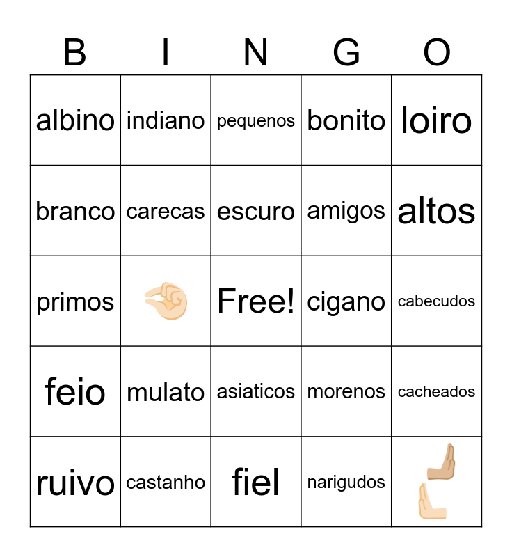 This bingo card has a free space and 24 words: mulato, castanho, escuro, ruivo, loiro, albino, branco, indiano, cigano, asiaticos, amigos, primos, morenos, cacheados, carecas, narigudos, cabecudos, pequenos, altos, 🤏🏻, 🫸🏼 🫷🏻, feio, bonito and fiel.
