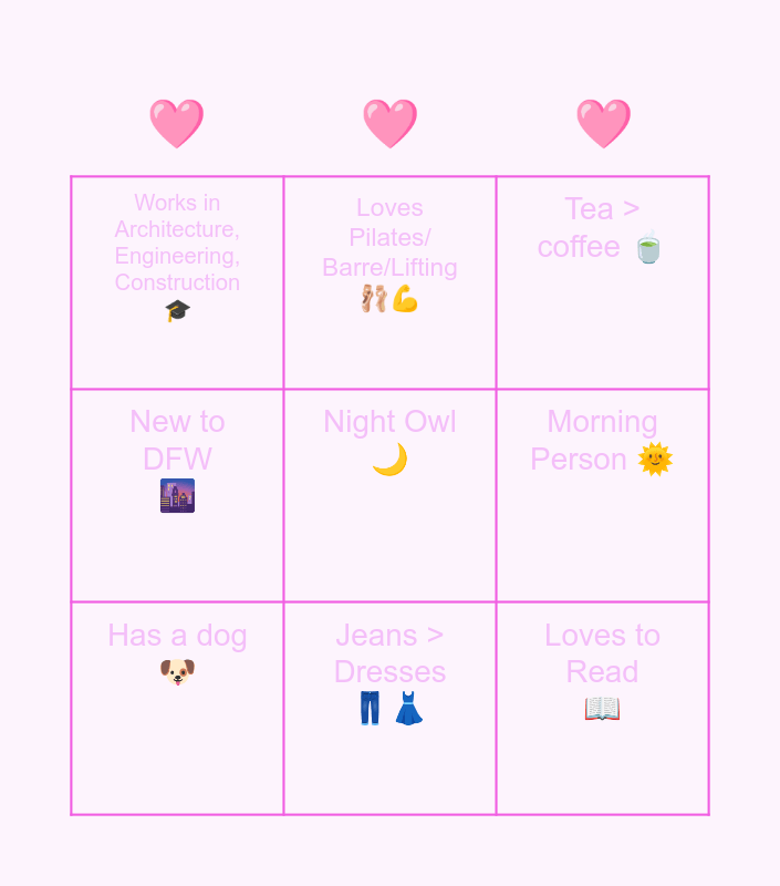 This bingo card has 9 words: Has a dog 🐶, Tea > coffee 🍵, Loves Pilates/ Barre/Lifting 🩰💪, New to DFW 🌆, Works in Architecture, Engineering, Construction 🎓, Morning Person 🌞, Night Owl 🌙, Loves to Read 📖 and Jeans > Dresses 👖👗.