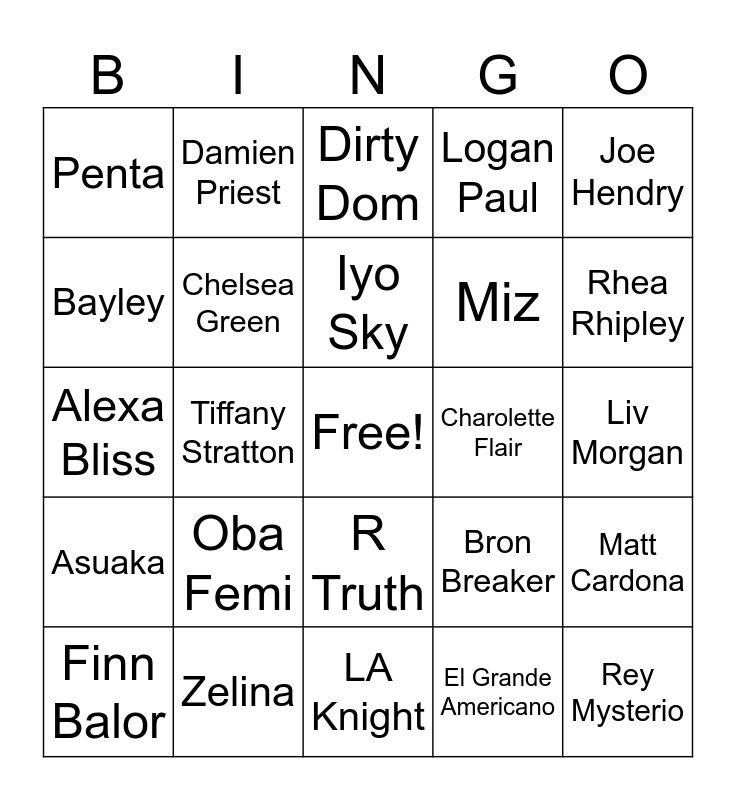 This bingo card has a free space and 29 words: Finn Balor, Nia Jax, Tiffany Stratton, Roman Reigns, Penta, Dirty Dom, Chelsea Green, Oba Femi, Charolette Flair, Zelina, Liv Morgan, Rey Mysterio, LA Knight, El Grande Americano, Rhea Rhipley, Randy Orton, R Truth, Asuaka, Joe Hendry, Alexa Bliss, Bron Breaker, Bianca Belair, Miz, Bayley, Logan Paul, Damien Priest, Matt Cardona, Iyo Sky and Sol Ruca.