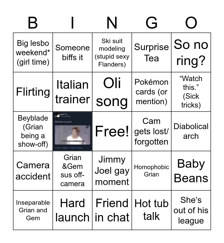 This bingo card has 1 images, a free space and 23 words: Grian &Gem sus off-camera, Hard launch, Oli song, Inseparable Grian and Gem, So no ring?, Big lesbo weekend* (girl time), Flirting, Someone biffs it, Cam gets lost/ forgotten, Jimmy Joel gay moment, Pokémon cards (or mention), Beyblade (Grian being a show-off), Homophobic Grian, Baby Beans, Italian trainer, Hot tub talk, Diabolical arch, Ski suit modeling (stupid sexy Flanders), “Watch this.” (Sick tricks), She’s out of his league, Camera accident, Surprise Tea and Friend in chat.