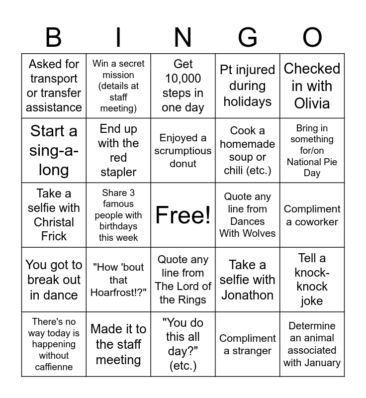 This bingo card has a free space and 24 words: "How 'bout that Hoarfrost!?", Made it to the staff meeting, Enjoyed a scrumptious donut, There's no way today is happening without caffienne, Checked in with Olivia, Asked for transport or transfer assistance, Start a sing-a-long, Win a secret mission (details at staff meeting), Quote any line from Dances With Wolves, Quote any line from The Lord of the Rings, Cook a homemade soup or chili (etc.), Take a selfie with Christal Frick, Take a selfie with Jonathon, Tell a knock-knock joke, End up with the red stapler, Compliment a stranger, Compliment a coworker, Get 10,000 steps in one day, Bring in something for/on National Pie Day, Share 3 famous people with birthdays this week, Determine an animal associated with January, You got to break out in dance, Pt injured during holidays and "You do this all day?" (etc.).