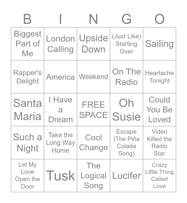 This bingo card has a free space and 75 words: Another One Bites the Dust, Another Brick In the Wall, Pt. 2, Upside Down, Hit Me With Your Best Shot, Call Me, Rock With You, Funkytown, You Shook Me All Night Long, It's Still Rock and Roll to Me, Whip It, D.I.S.C.O., Ten O'Clock Postman, Weekend, Rapper's Delight, Xanadu, I Have a Dream, Midnight Dynamos, Crazy Little Thing Called Love, Fame, Sailing, II Tempo Se Ne Va, Santa Maria, America, London Calling, (Just Like) Starting Over, Magic, Freeway of Love, Lost in Love, Cars, Brass In Pocket, The Rose, Refugee, Babe, Escape (The Piña Colada Song), Heartache Tonight, On The Radio, Matador, The Ballad of Lucy Jordan, Could You Be Loved, Lucifer, Oh Yeah, I'm Alright, You May Be Right, Crusin', Sara, Still, Let My Love Open the Door, Biggest Part of Me, What I Like About You, Ladies' Night, Don't Do Me Like That, Cool Change, This Is It, Against the Wind, Off the Wall, Train In Vain (Stand By Me), I Wanna Be Your Lover, Misunderstanding, Once In a Lifetime, He's So Shy, Take the Long Way Home, Ride Like the Wind, It's A Real Good Feeling, Boat On the River, Take that Look off Your Face, Oh Susie, No Doubt About It, Sun of Jamaica, Confusion, Video Killed the Radio Star, Such a Night, Tusk, Love On the Line, The Logical Song and Who'll Come With Me (David's Song).
