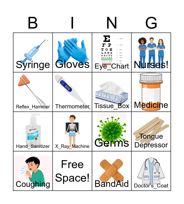 This bingo card has 22 images and 24 words: Stethoscope, Hand_Washing, Medicine, Face_Mask, Reflex_Hammer, Syringe, Thermometer, Gloves, Free Space!, Sneezing, Hand_Sanitizer, Germs, Otoscope, Blood_Pressure_Cuff, Tissue_Box, Fever, BandAid, Eye_Chart, X_Ray_Machine, Tongue Depressor, Coughing, Doctor's_Coat, Nurses! and Free Space!.