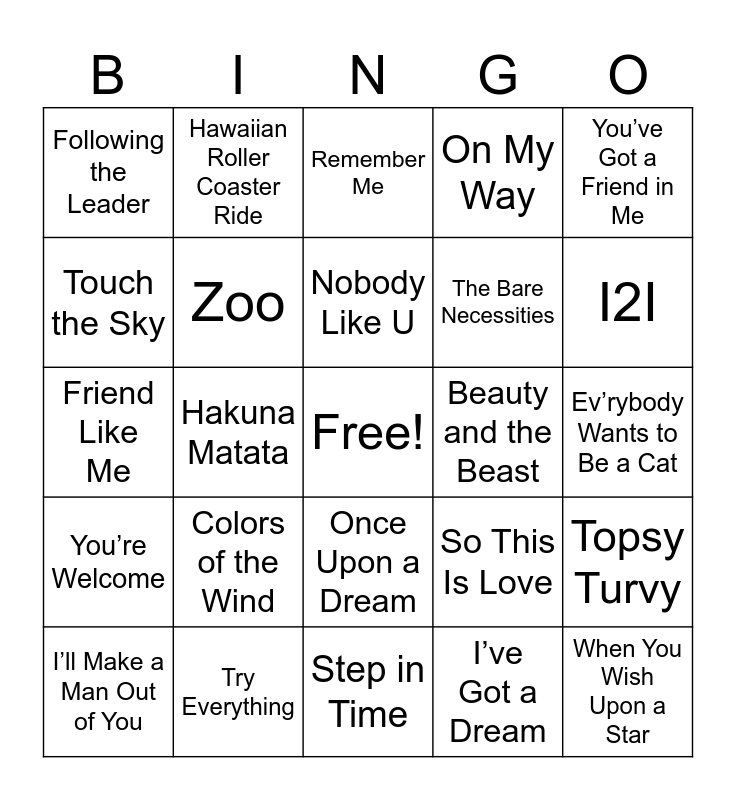 This bingo card has a free space and 33 words: We Don’t Talk About Bruno, Under the Sea, Hakuna Matata, Let It Go, You’re Welcome, Zoo, You’ve Got a Friend in Me, I’ll Make a Man Out of You, Hawaiian Roller Coaster Ride, Zero to Hero, Nobody Like U, Remember Me, Life is a Highway, You’ll Be in My Heart, Beauty and the Beast, I2I, Try Everything, Friend Like Me, Colors of the Wind, So This Is Love, Once Upon a Dream, If I Didn’t Have You, Following the Leader, Ev’rybody Wants to Be a Cat, Step in Time, When You Wish Upon a Star, On My Way, The Bare Necessities, Touch the Sky, Topsy Turvy, Why Should I Worry, I’ve Got a Dream and Cruella De Vil.