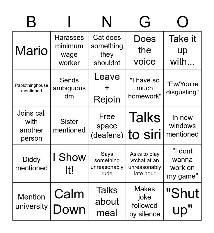 This bingo card has a free space and 24 words: I Show It!, Calm Down, Leave + Rejoin, Mention university, Take it up with..., Mario, Pablothinghouse mentioned, Harasses minimum wage worker, Talks to siri, Says something unreasonably rude, "I have so much homework", Joins call with another person, Asks to play vrchat at an unreasonably late hour, "I dont wanna work on my game", Sends ambiguous dm, Makes joke followed by silence, In new windows mentioned, Cat does something they shouldnt, "Ew/You're disgusting", Sister mentioned, "Shut up", Diddy mentioned, Does the voice and Talks about meal.