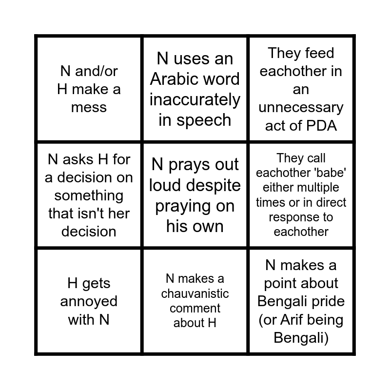 This bingo card has 9 words: H gets annoyed with N, They feed eachother in an unnecessary act of PDA, N uses an Arabic word inaccurately in speech, N asks H for a decision on something that isn't her decision, N and/or H make a mess, They call eachother 'babe' either multiple times or in direct response to eachother, N prays out loud despite praying on his own, N makes a point about Bengali pride (or Arif being Bengali) and N makes a chauvanistic comment about H.