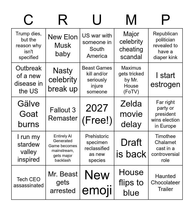 This bingo card has a free space and 24 words: Entirely AI Generated Game becomes mainstream, gets major backlash, Mr. Beast gets arrested, Beast Games kill and/or seriously injure someone, Tech CEO assassinated, Republican politician revealed to have a diaper kink, Trump dies, but the reason why isn't specified, Outbreak of a new disease in the US, New Elon Musk baby, Zelda movie delay, Prehistoric specimen reclassified as new species, Maximus gets tricked by Mr. House (FoTV), Gälve Goat burns, Draft is back, Timothee Chalamet cast in a controversial role, Nasty celebrity break up, House flips to blue, Far right party or president wins election in Europe, US war with someone in South America, I start estrogen, Fallout 3 Remaster, Haunted Chocolateer Trailer, I run my stardew valley inspired, Major celebrity cheating scandal and New emoji.