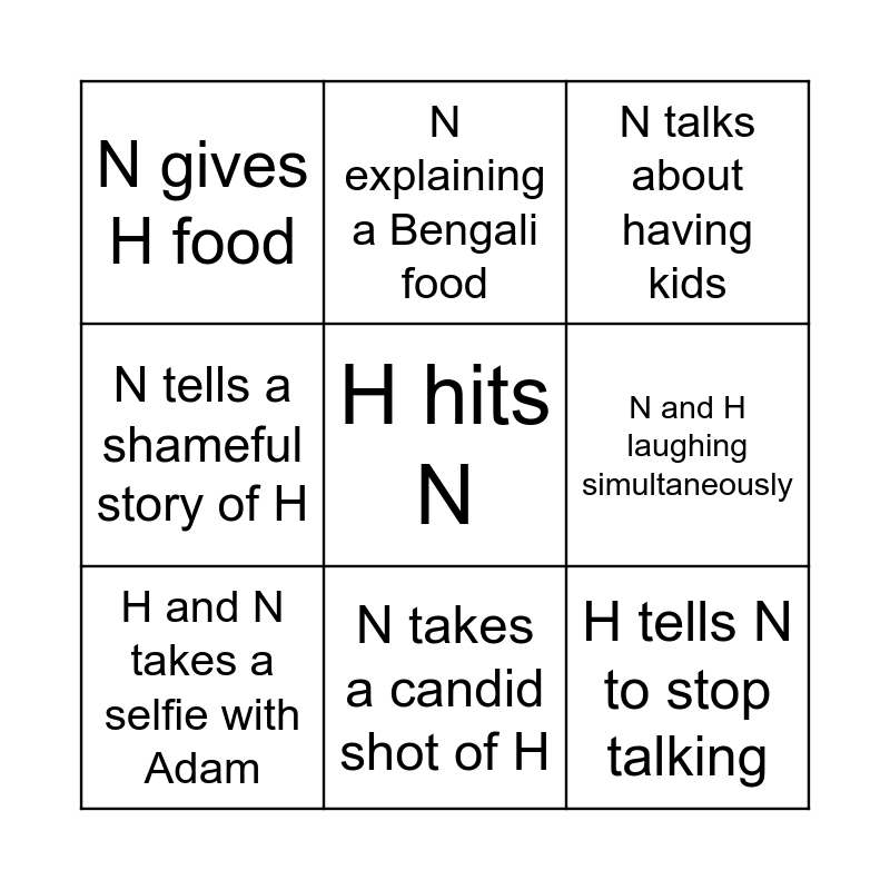 This bingo card has a free space and 8 words: N and H laughing simultaneously, N talks about having kids, N explaining a Bengali food, H and N takes a selfie with Adam, N gives H food, H tells N to stop talking, N tells a shameful story of H and N takes a candid shot of H.