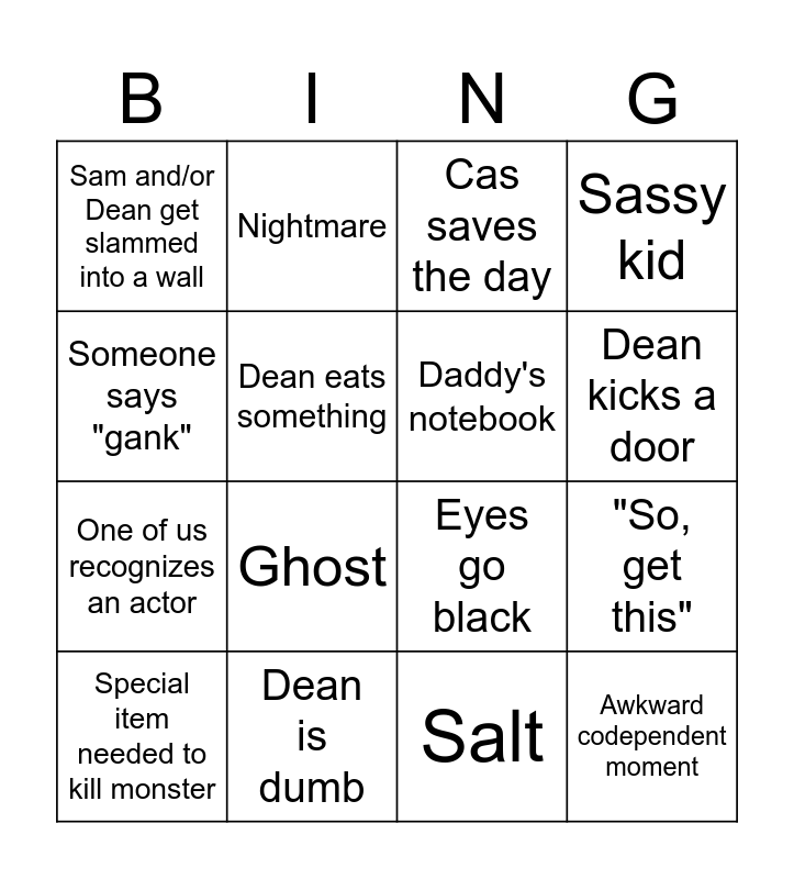 This bingo card has 16 words: Dean is dumb, "So, get this", Cas saves the day, Sam and/or Dean get slammed into a wall, One of us recognizes an actor, Nightmare, Eyes go black, Salt, Someone says "gank", Dean eats something, Special item needed to kill monster, Sassy kid, Ghost, Dean kicks a door, Daddy's notebook and Awkward codependent moment.