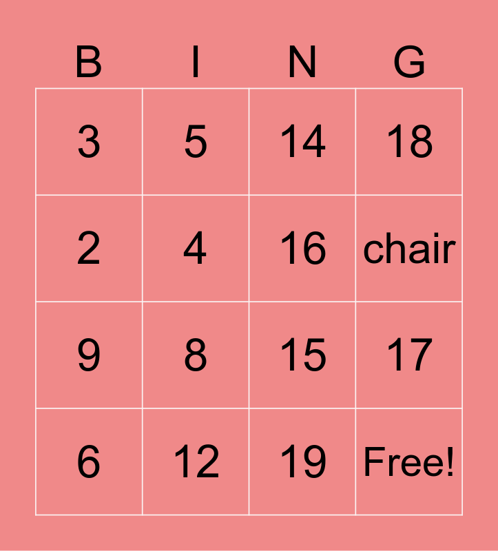 This bingo card has 23 words: Free!, flag, chair, 1, 2, 3, 4, 5, 6, 7, 8, 9, 10, 11, 12, 13, 14, 15, 16, 17, 18, 19 and 20.