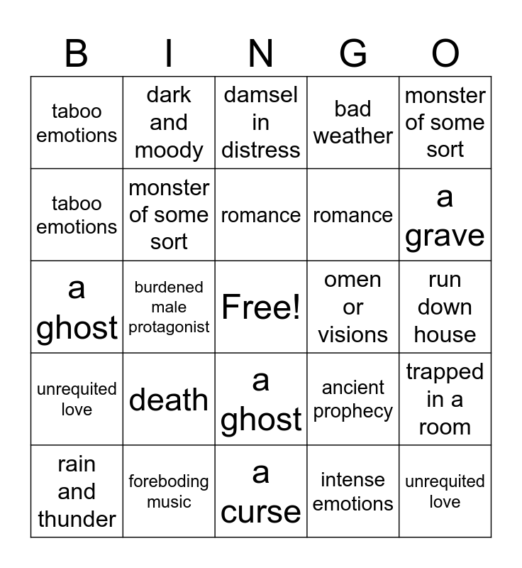 ⚠ This card has duplicate items: family secrets (3), dark and moody (3), burdened male protagonist (3), supernatural elements (3), omen or visions (3), foreboding music (3), bad weather (3), damsel in distress (3), romance (3), intense emotions (3), rain and thunder (3), supernatural event (3), a grave (3), taboo emotions (3), a curse (3), a ghost (3), ancient prophecy (3), monster of some sort (3), haunted house or castle (3), run down house (3), death (3), unrequited love (3), trapped in a room (3), strange place (3)