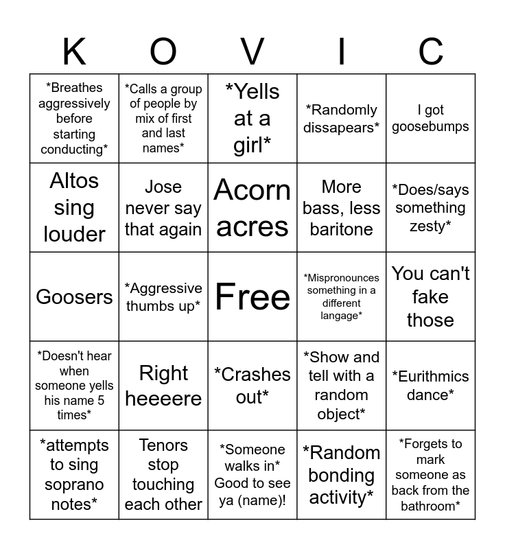 This bingo card has a free space and 24 words: Right heeeere, Tenors stop touching each other, Acorn acres, *attempts to sing soprano notes*, I got goosebumps, *Breathes aggressively before starting conducting*, Altos sing louder, *Calls a group of people by mix of first and last names*, *Mispronounces something in a different langage*, *Crashes out*, More bass, less baritone, Goosers, *Show and tell with a random object*, *Eurithmics dance*, Jose never say that again, *Random bonding activity*, You can't fake those, *Yells at a girl*, *Does/says something zesty*, *Aggressive thumbs up*, *Forgets to mark someone as back from the bathroom*, *Doesn't hear when someone yells his name 5 times*, *Randomly dissapears* and *Someone walks in* Good to see ya (name)!.