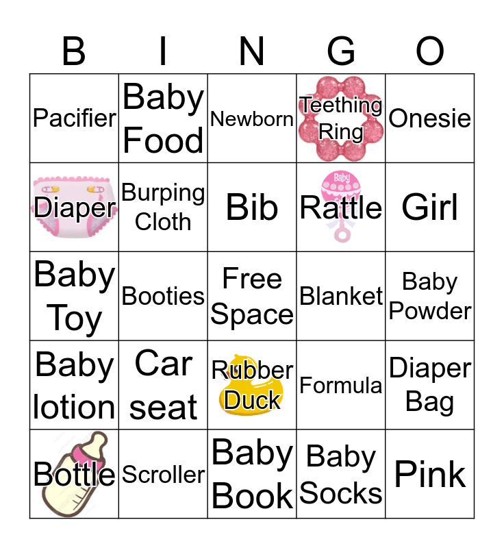 This bingo card has 5 images, a free space and 24 words: Car seat, Scroller, Bib, Bottle, Onesie, Pacifier, Diaper, Baby Food, Blanket, Rubber Duck, Rattle, Baby Toy, Formula, Diaper Bag, Burping Cloth, Baby Socks, Baby Powder, Newborn, Girl, Booties, Pink, Baby lotion, Teething Ring and Baby Book.